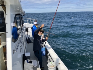 大きな マダイ が上がった瞬間には船上が大盛り上がり。続いて立派な ツバス(ブリの若魚) も姿を見せ、釣り上げた社員の笑顔が印象的でした。